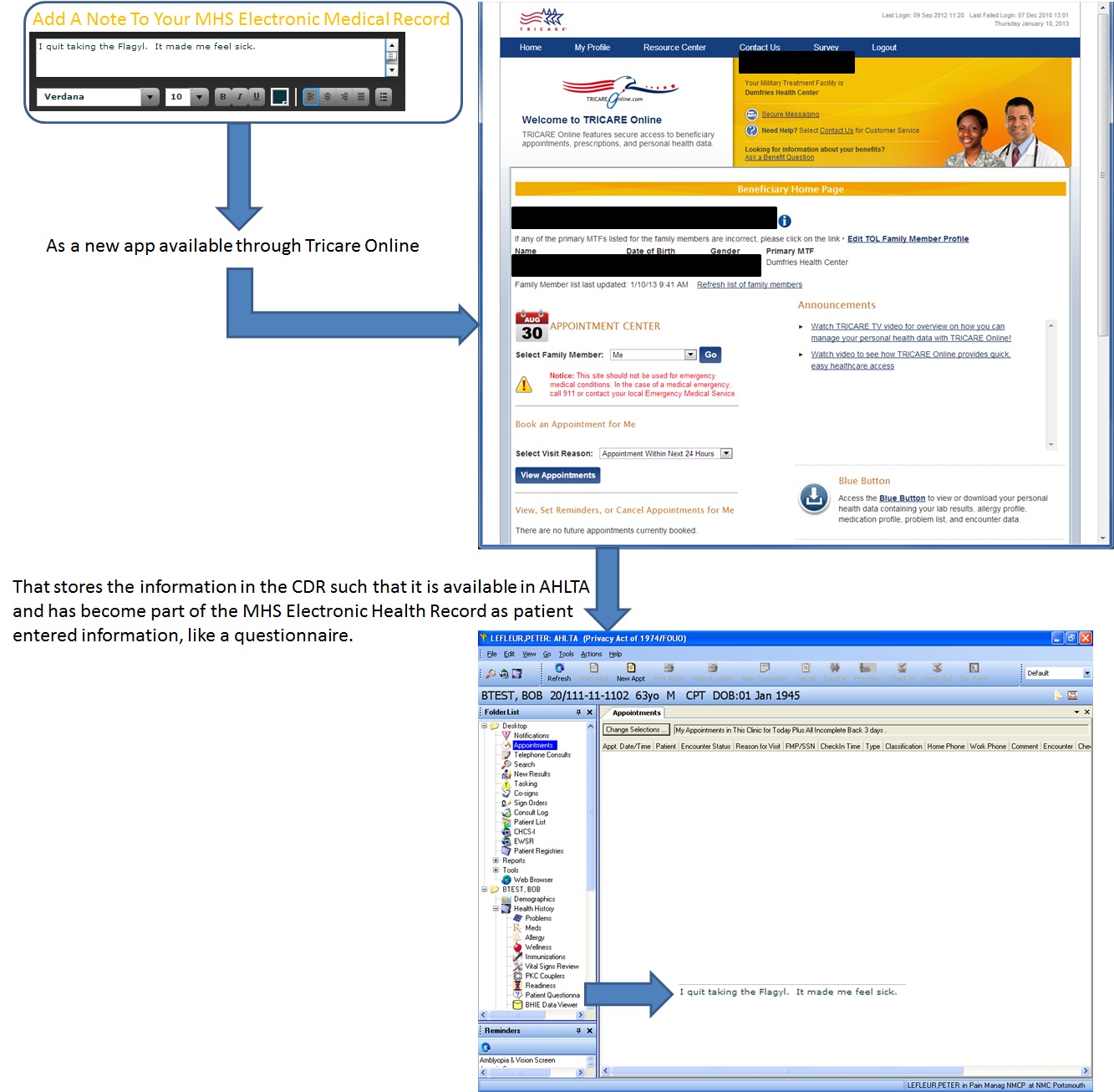 As-is, the patient has no way of adding information to his or her MHS electronic health record. The patient's experience of care could be improved and health care costs could be reduced by giving the patient the ability to enter information into their own medical record. This could be done via a new feature on Tricare Online that provides a text area that writes a note from the patient into the MHS AHLTA system’s CDR database. Information entered by the patient in this way would then be available through AHLTA to DoD health care providers in the future.