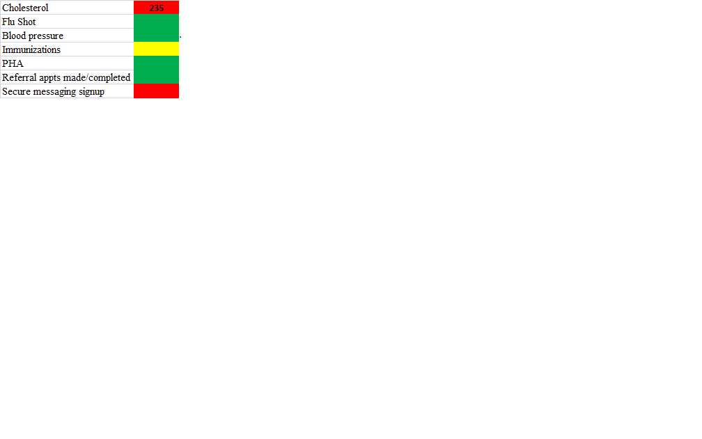 Cholesterol Flu Shot Blood pressure Immunizations PHA Referral appts made/completed Secure messaging signup (this one answers these as well - Experience of Care: How do we provide the highest quality care that is patient and family centered? and Per Capita Cost: How do we bend the cost curve by reducing cost and removing inefficiencies?) etc