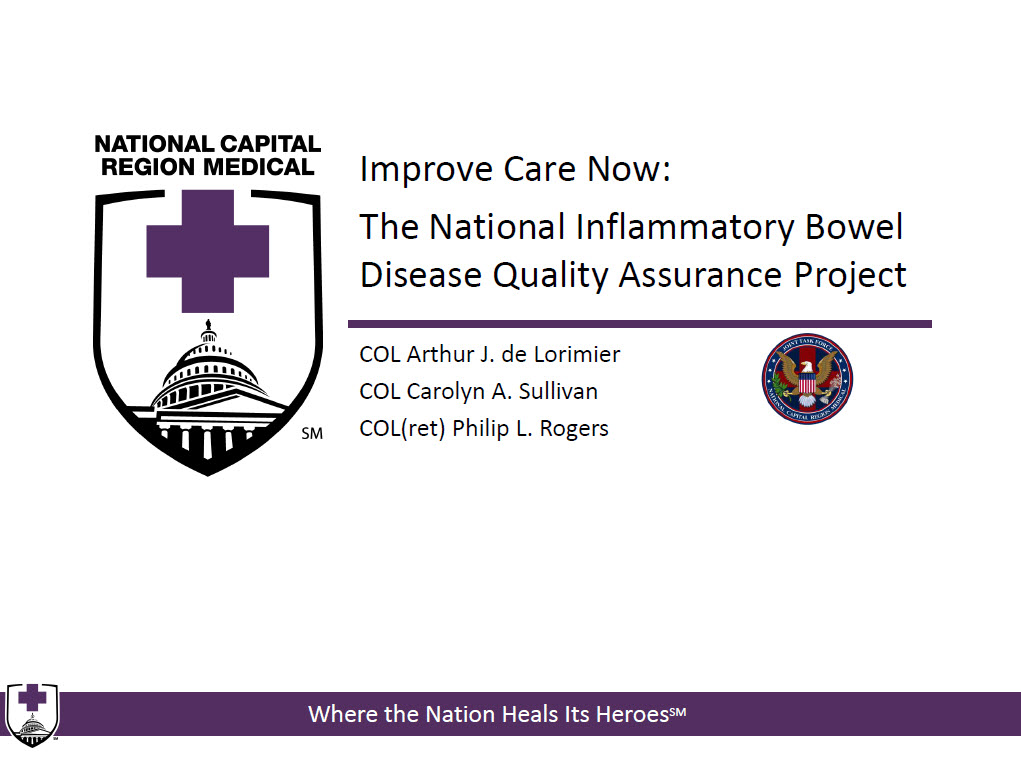 The Pediatric Gastroenterology Division (PED-GI-WR) at Walter Reed National Military Medical Center (WRNMMC) proposes the initiation of its participation in Improve Care Now (ICN), the only quality assurance program designed to bring standardization and Improved healthcare outcomes for children suffering from Inflammatory Bowel Disease (IBD).