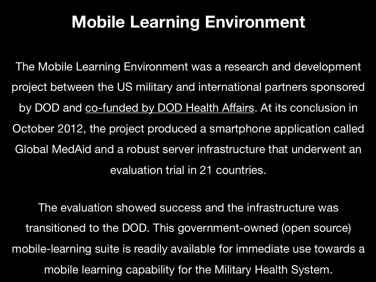 A recently completed DoD mobile learning technology infrastructure development project called the Mobile Learning Environment (MoLE) Project succeeded in trialling a prototype mobile learning capability, and developing an open source, cross-platform mobile App infrastructure that solves many of the technical barriers currently limiting widescale adoption, as well as enabling m-learning tools and content to be shared between multiple different smartphone platforms. This environment underwent international trials with 21 countries showcasing content designed for deploying medical personnel responding to a disaster, as a proof of concept via an App called GlobalMedAid. DOD Health Affairs co-funded this project.