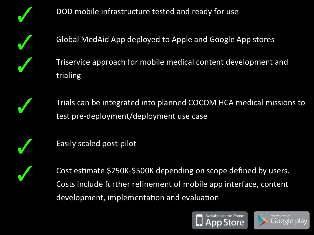 The costs and approach for this project are scalable. It is estimated that a pilot could range from $100,000 to $500,000 depending on the scope directed by MHS leaders and targeted end-users. Costs could cover further refinement of the mobile interface and navigation mobile content development to enhance utility, and program management, implementation evaluation support, as well as, a business plan for transition of the capability.