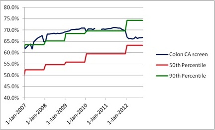 Background: Let’s face it: no one likes dealing with poop. Colon cancer has an excellent prognosis however, if detected early. Although there are a variety of effective screening methods, even the top ten percent of health programs nationwide have only screened 74.2 % of the their at risk population based on aggregate data from 2011. The Military Health System (MHS), despite having what is nearly “free” medical care and minimal out of pocket expenses, does more poorly, with only 72.78 % of at-risk patients screened as of October 2012. Possible reasons for not obtaining colon cancer screening include not wanting to undergo the uncomfortable “prep” for the procedure which also usually involves taking a day off of work to recover from the sedation used. The fecal immunohistochemical testing is an alternative to colonoscopy that is simpler to use and more sensitive than older fecal occult blood testing. Fecal immunohistochemical testing does not require any dietary restrictions which the older occult blood screens require, and only requires one stool sample compared to three consecutive samples in occult blood screens. As a result, this test could be especially useful to screen the “colonoscopy-averse” population.