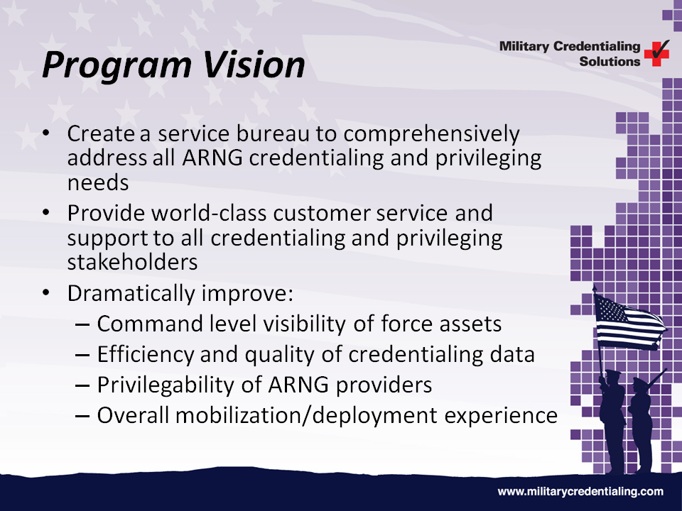 In June 2006, the Army National Guard (ARNG) Chief Surgeon’s Office began working with a management consulting firm (Tenon Consulting) to design and implement a centralized clinical credentialing capability for its approximately 1,500 privileged providers. The ARNG sought to improve the readiness and mobility of these providers while assuring the clinical competency of these individuals in order to provide the highest level of care to our fighting forces. The resulting capability, as designed and implemented, is a scalable solution leveraging collaborative public/private partnerships, proven commercial technology, and industry best practices to modernize the credentialing process.