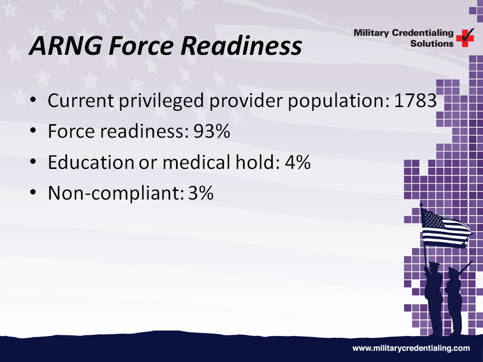 To date, the team has achieved a 98+% CCB approval rate for files presented, and has received outstanding customer satisfaction marks from MTFs receiving ARNG ICTBs based on quality, reliability, and timeliness. This centralized credentialing program allows providers, ARNG leadership, MTFs, and privileging authorities real-time visibility of provider credentials. This process has leveraged experienced personnel, streamlined processes, and cutting-edge technology to significantly improve the quality, visibility, and scalability of the credentialing process throughout the ARNG. We are currently expanding this capability to include credentialing for new ARNG accessions, and are exploring how this solution can be implemented to support other force components.