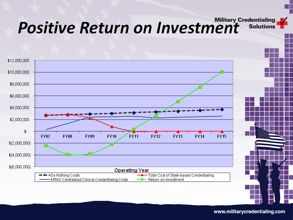 This project is being completed on a firm, fixed price basis. Each phase and milestone of the project has been completed on time and on or under budget to date under the guidance of the ARNG Chief Surgeon’s Office. By leveraging industry-leading private sector partners, the ARNG has achieved significant financial savings over the project life cycle while realizing a positive return on investment (ROI) in less than four years, as depicted in the chart above. Projected costs and ROI through FY15 are also included in the chart. In addition to the cost savings, by outsourcing a portion of the credentials work and centralizing the remainder to a small, dedicated team of credentialing professionals, the ARNG has returned approximately 40 full-time-equivalent (FTE) clinical officers to their primary state-based duties including training, scheduling, recruiting, and privileging activities. This number was derived through analysis of the decentralized model wherein .75 FTEs per state/territory were estimated to perform credentialing duties (.75 x 54 = 40.5). In addition, the program is currently projected to be over $455,000 under budget, including labor cost reductions and travel savings, through the end of Option Year 4 of the current contract phase.