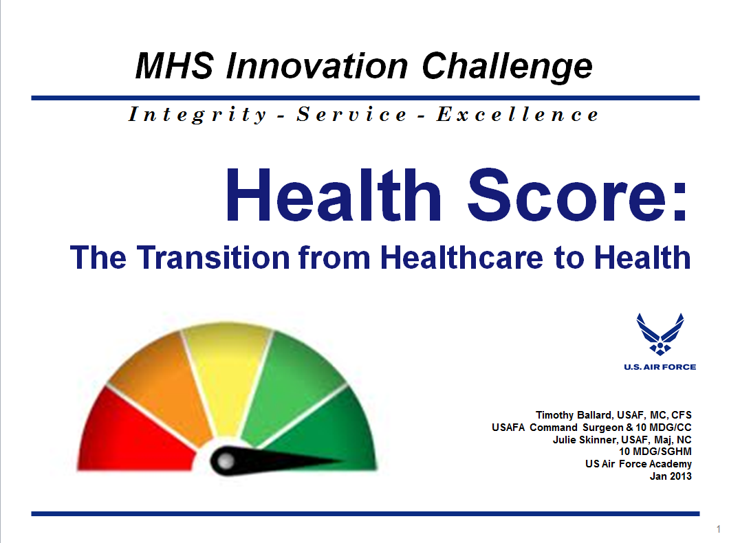 TRENDS: A quick internet search shows several websites in development of a personalized health score, to include factors such as smoking, blood pressure, nicotine use, cholesterol level, sleep, exercise and diet. The fact that such websites are in development, indicates increased consumer demand for more information regarding health status. Capitalizing on the need for more consumers to become aware of their personal health status and the current evolution of the Electronic Health Record, it would be advantageous to lay a foundation for collecting data points relevant to a health score. Furthermore, the implementation of a personalized health score, available to each DoD beneficiary, as well as collectively available to health care teams and administration will advance our society into the future of an objective/outcomes based health care model. (Transition from Health Care to Health)
