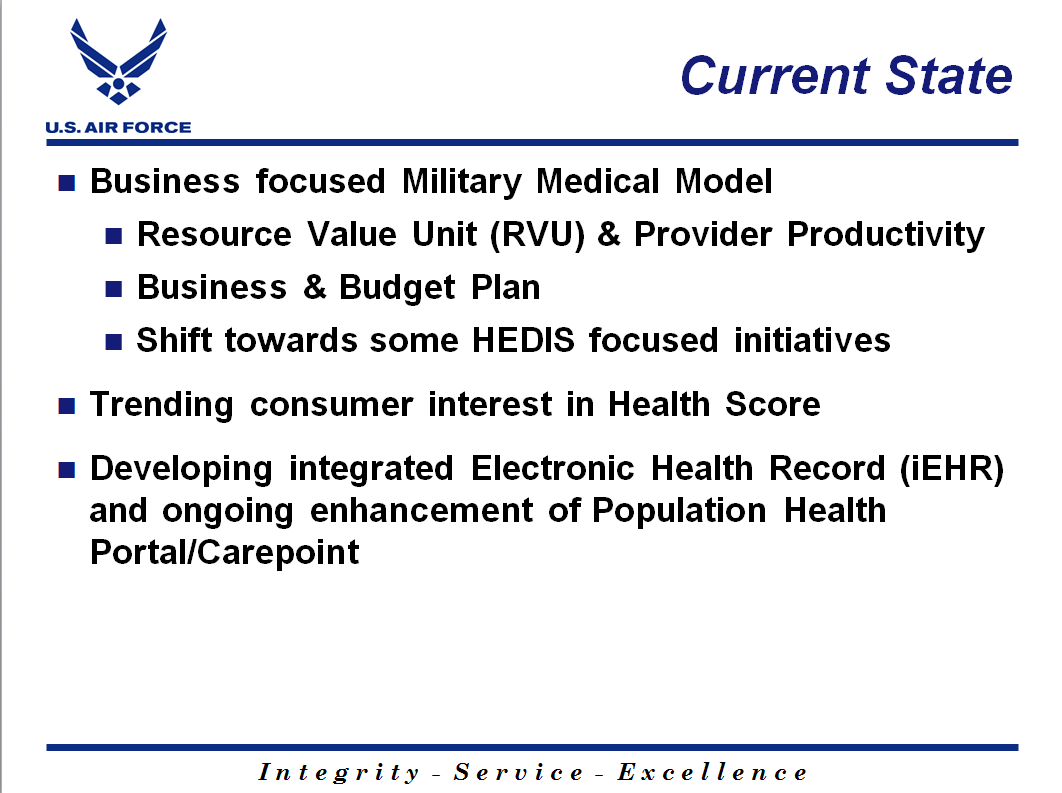 RESULTS: True patient centric care provides the patient with a tangible measure of their health status and specific information on how to improve it. This will inherently improve Experience of Care for our patients. The objective measure of a comprehensive Population Health score gives commanders and staff a standardized goal across the MHS: to improve the Health of their enrolled population instead of chasing RVU’s. Readiness improves as patients have direct access to their health care status and patients, through increased awareness, find personal incentives to improve their health. Finally, Per Capita Cost improves as all MHS MTFs are focused on a cost reduction model based on improving overall health.
