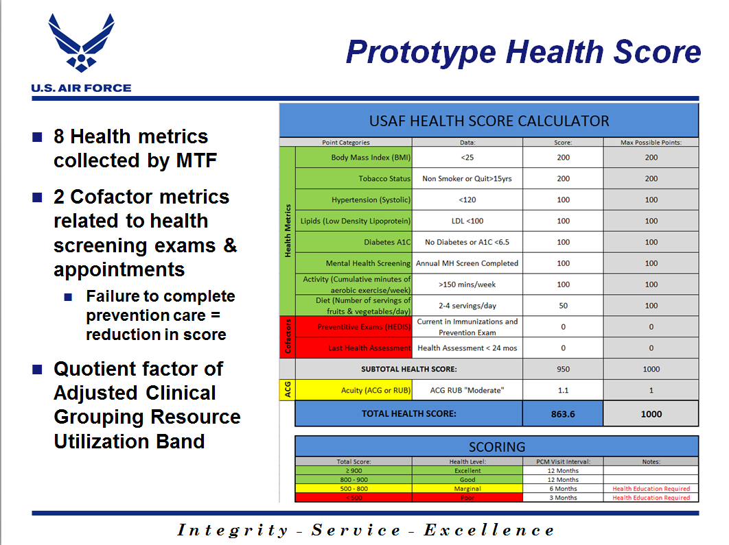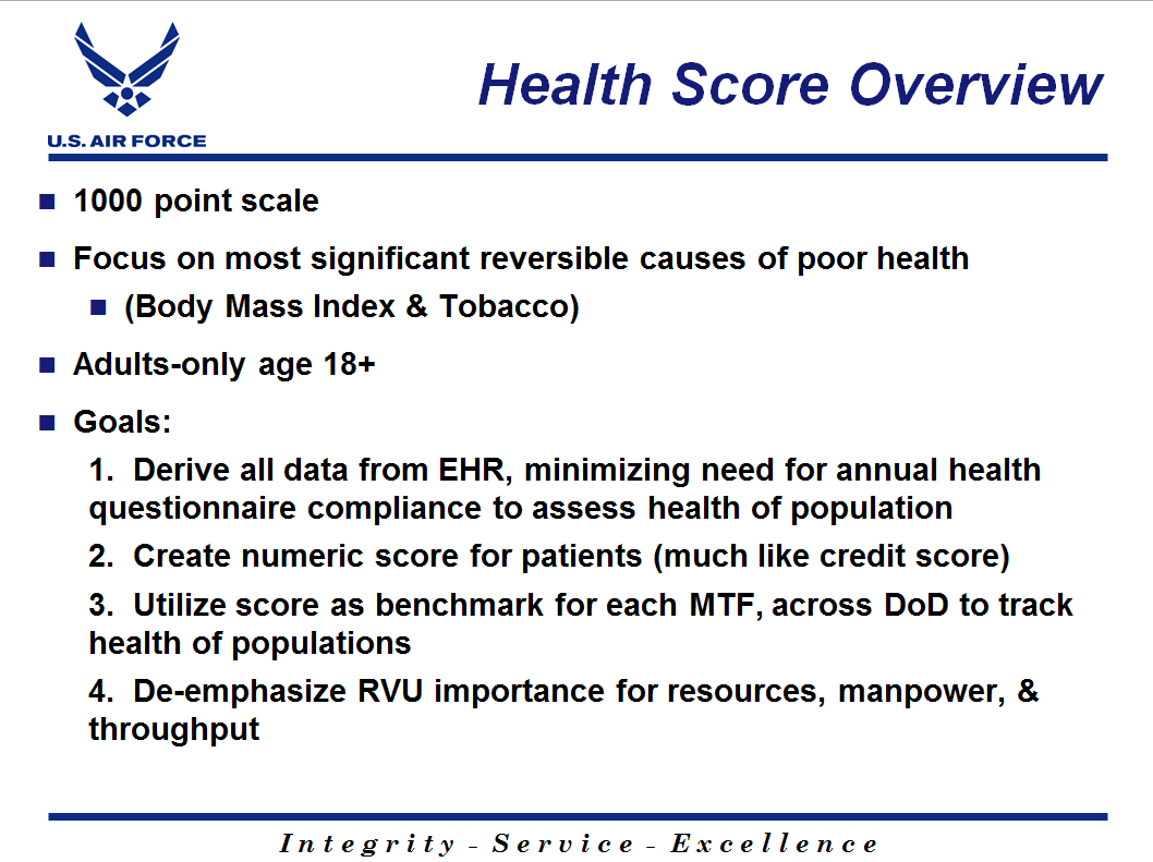 BACKGROUND: The military medical model has previously been focused on healthcare: Relative Value Units (RVU), provider productivity, and business plans, with little regard to the actual health outcomes/status of a population. As Patient Centered Medical Home was implemented, pay for performance incentives focused attention on HEDIS metrics alone to include diabetes, cancer prevention exams, and asthma. Introduced in fall 2011, the Adjusted Clinical Grouping scores provided a more comprehensive and objective tool to measure expected use of MTF and network resources. While the ACG scores are useful to administrative management of health care resources, they do not engage the patient in a proactive way to take initiative to manage their own health care. Health Care Integrators and Primary Care Teams, consistently reacting to HEDIS metrics, plead and nag their patients to complete health screenings and essential self-care.