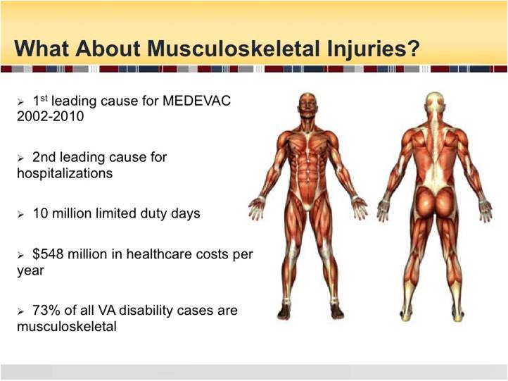 It is an annual requirement to screen every Service member for hearing, vision, dental, and overall health wellness. We also routinely screen for other medical conditions (HIV) and mental health. However, we don’t screen for musculoskeletal injuries, which are the primary source of disability in the U.S. Military. They affect over 900,000 service members annually; resulting in over 25 million limited-duty days. In 2007 alone they were responsible for approximately 2.4 million medical visits to military treatment facilities and accounted for $548 million dollars in direct patient care costs. These injuries decimate our units at a much faster pace than any combat-related injuries, and the associated disability long carries over into retirement and separation.