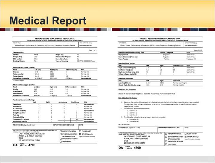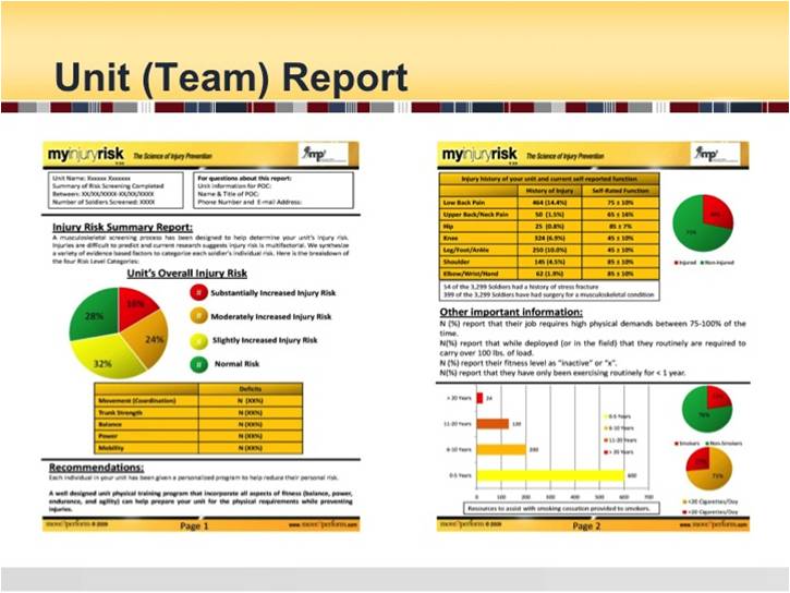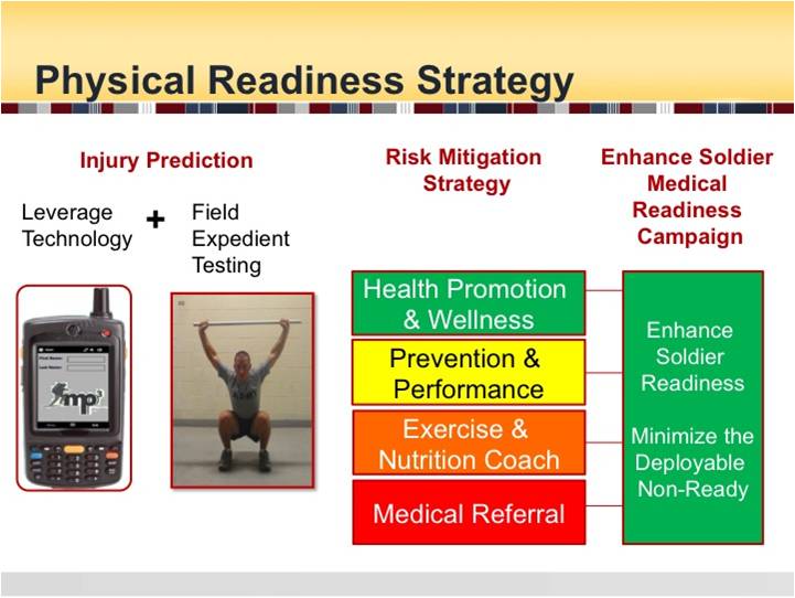 We are proposing the use of an injury risk screening protocol (we've piloted on 1500 Soldiers. Each Service Member will get a personalized report, an injury risk stratification score (1-5), and action plan which includes a direct referral to a specialist if they are in the highest risk injury group (exercise prescription, smoking cessation, mental health, etc). Their PCM will be able to track their risk status in their medical records in the same manner that they track any other common variables, such as cardiovascular risk factors, etc. We propose to pilot this in the US Army, but it can easily become a DoD tri-service integration solution across other services.