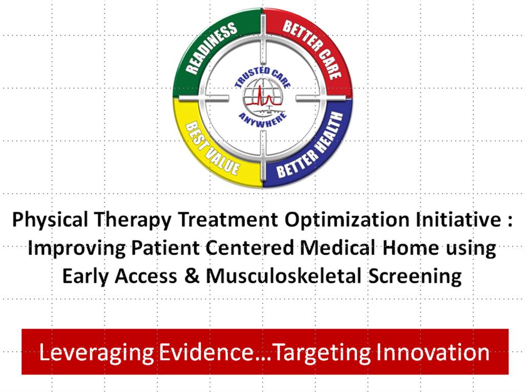 Building upon the growing volume of evidence for physical therapy and capitalizing on the success of the Behavioral Health Optimization Program (BHOP) model, the PT2O concept breaks the mold on the traditional delivery mechanism for physical therapy and places them within the family health clinic to expedite the management of musculoskeletal injuries. As Dr. Anthony Beutler highlighted during the 2012 MHS conference, musculoskeletal injury is the leading cause of lost duty time in the military. As the military continues to right-size and navigate the fiscal constraints, innovations that can increase access for MHS beneficiaries and minimize lost duty time will directly impact our readiness and experience of care. The headlines are filled with budgetary analyses which highlight soaring healthcare costs as a threat to our national security. The associated direct and indirect health care cost of musculoskeletal injuries sustained by our MHS beneficiaries is estimated to be in the billions. The Department of Labor and Health projects a 30% increase in physical therapy utilization over the next five years. As the median age of our population continues to rise and the expectation to participate fully in high level physical activities well into retirement years, the volume of orthopedic cases such as total joint replacements will climb considerably. Additionally, as our younger population returns to physical fitness and sporting activities, the incidence of sports-related injuries and associated post-operative rehabilitation for both of these populations will increase.