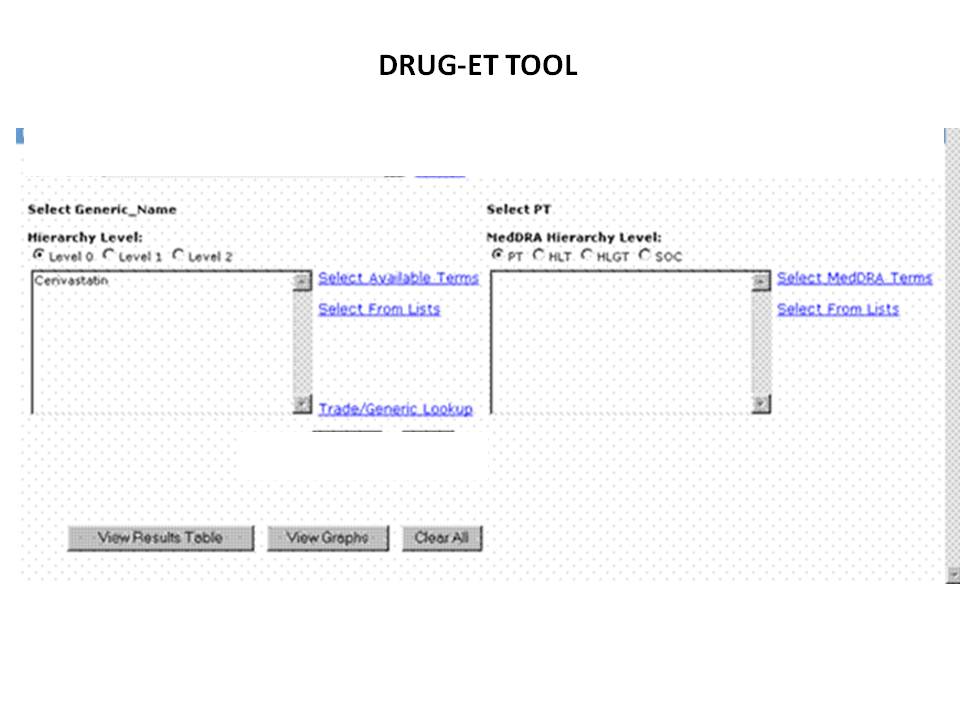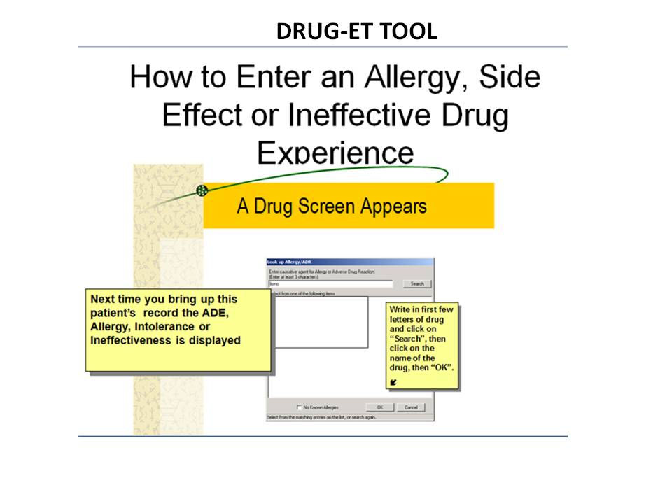 Currently, the Allergy Section of AHLTA does not capture the 3 types of Adverse Drug Experiences (ADE) experienced by our patients: Allergy, Drug Intolerance (or side effect), and Drug Ineffectiveness. Research performed by staff at WRAMC demonstrated poor documentation of side effects in the Allergy Section. This results in patients running the risk of reexposure to a drug that they had a serious but non-allergic side effect or to a drug that is ineffective. This new tool, the Drug-Event Tracker will 1)collect and document all ADE's and document this information in the medical record (the modified Allergy Section) and 2) if serious, report the event to the FDA via populating the FAERS report, and 3) collect these reports into a database to enable safety staff to report to leadership the frequency of ADEs in the MHS population. Besides being a direct part of AHLTA, this tool will also receive input from CHCS at the drug discontinuation module. This module, currently poorly used but with minor modification, has the capability to document why a provider is discontinuing a drug: Seven choices need to be added and include Allergy, Drug Side Effect, Drug Ineffective, Completed Treatment, Patient Declined Intervention, Dose Change, Other. This information will communicate among a team of provides why a patient was removed from their medication and, feeding into the Allergy Section of AHLTA, will prevent reexposure, both a cost and safety issue.